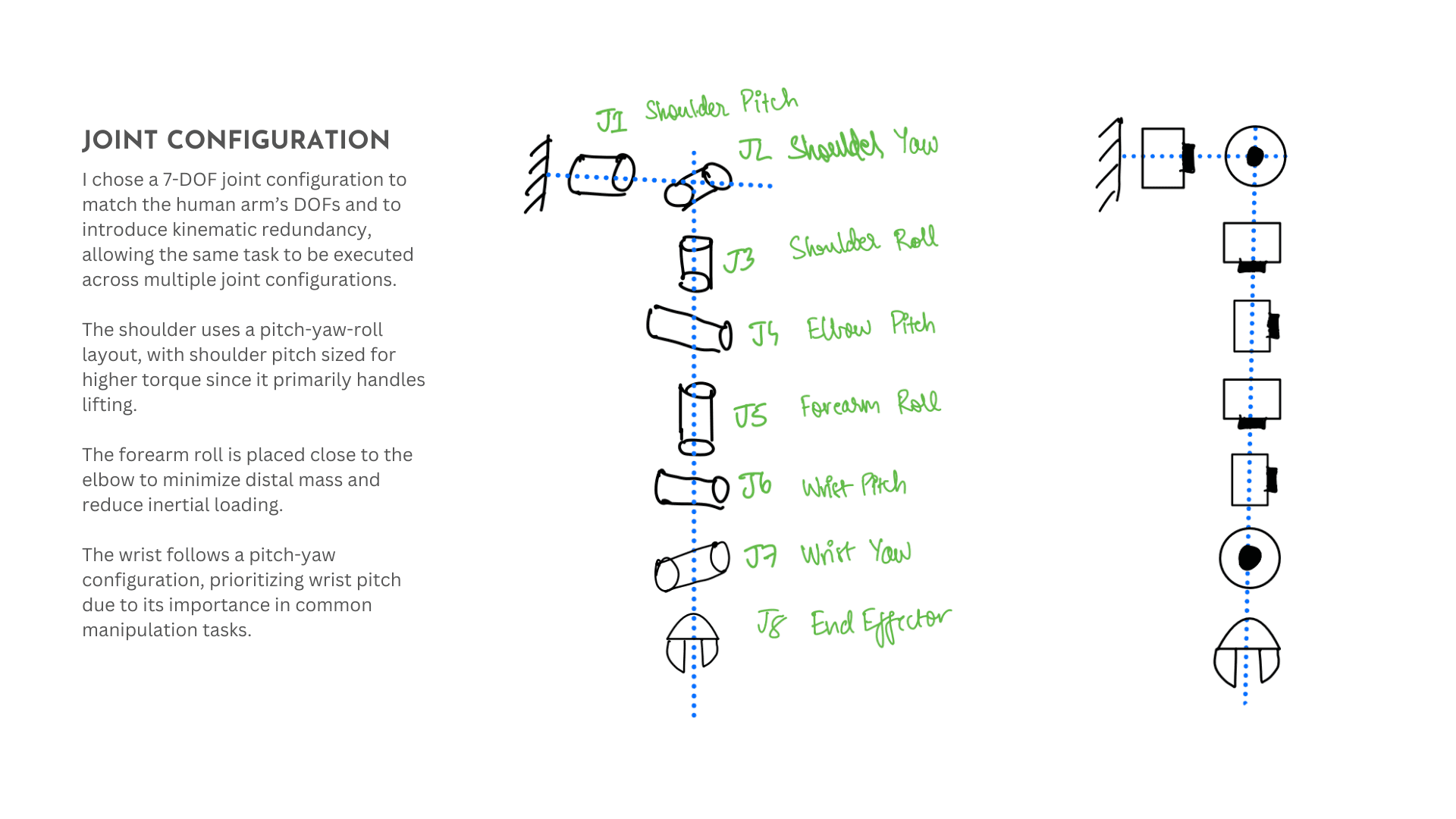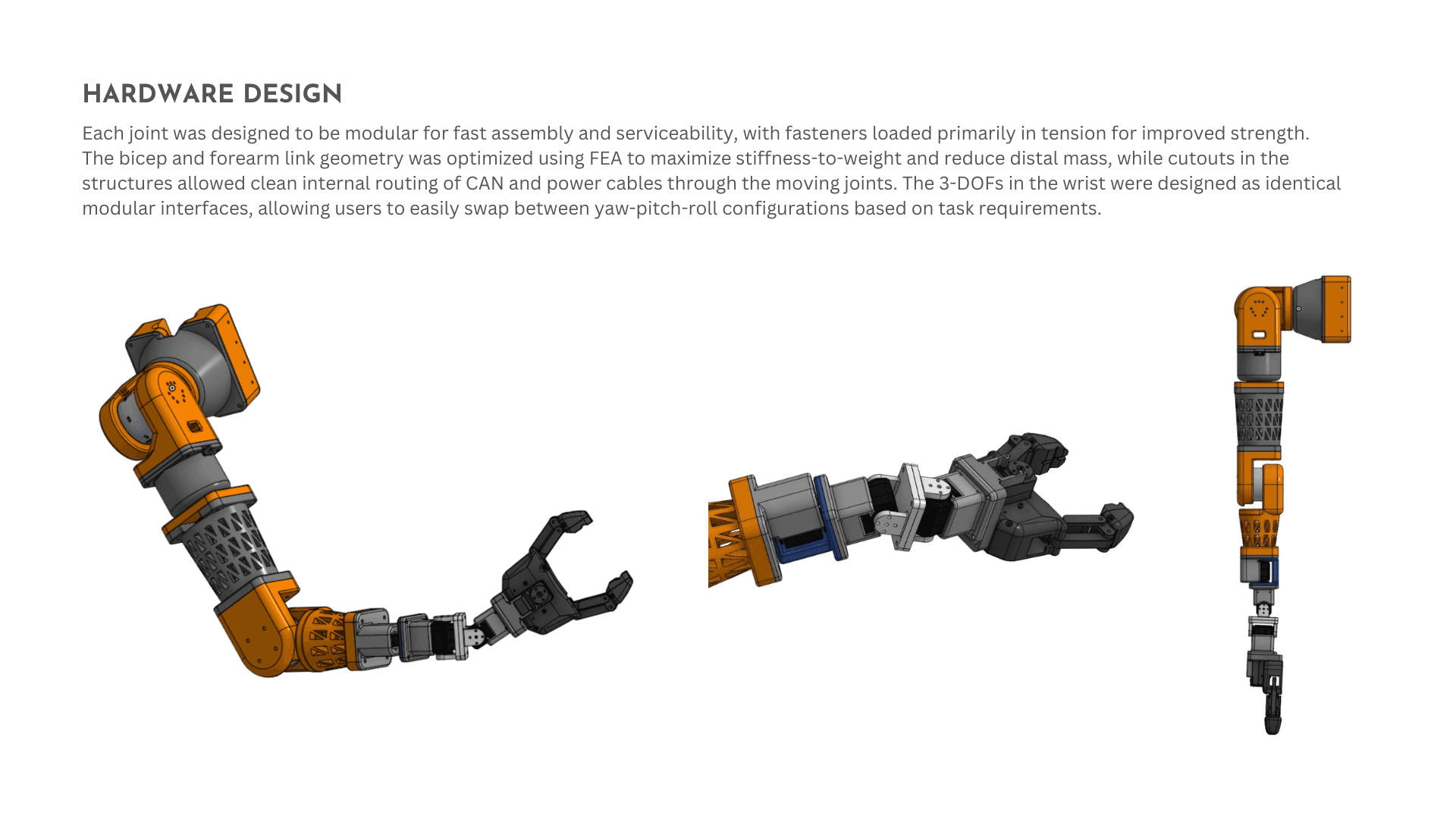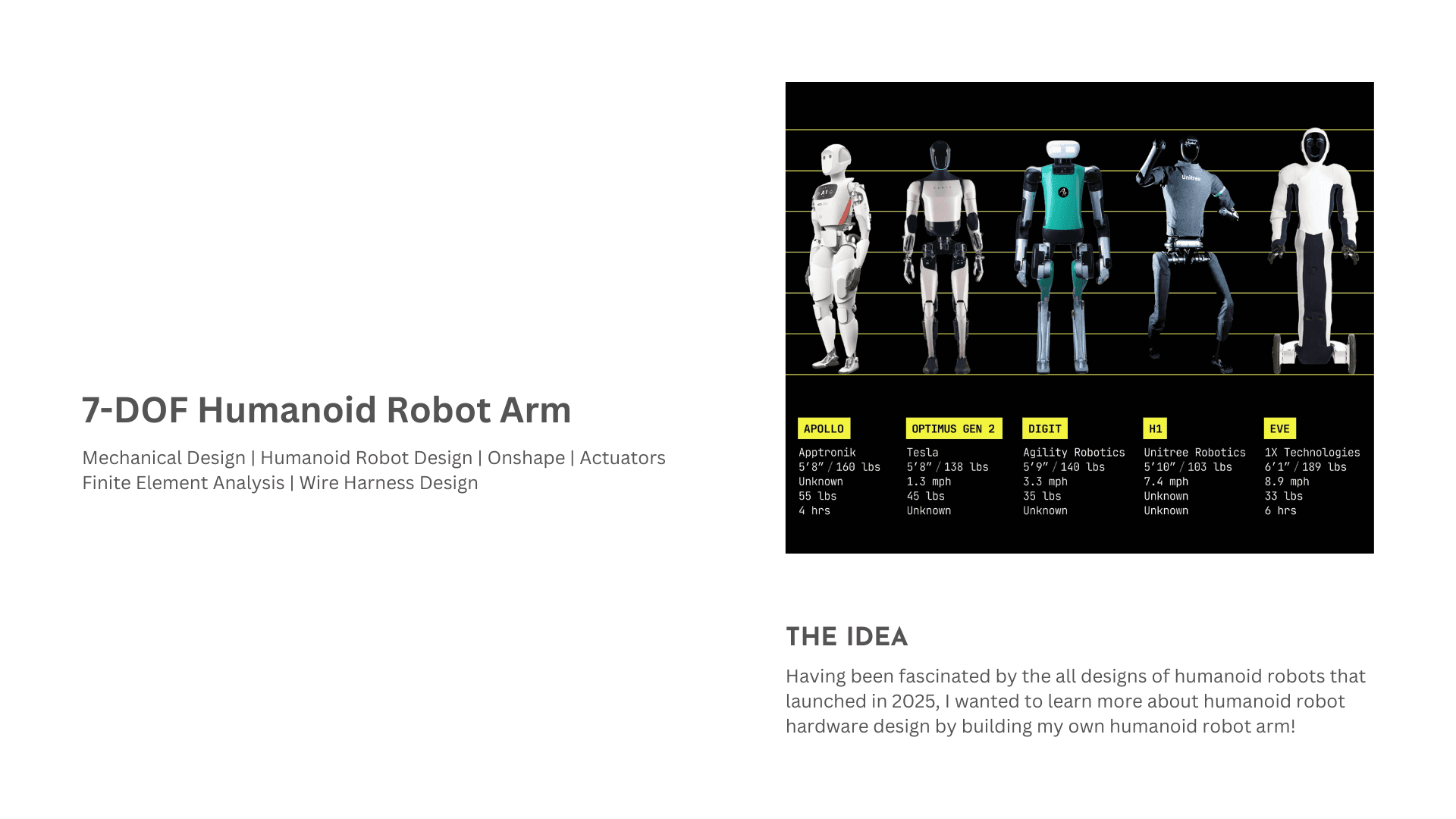 Having been fascinated by the all designs of humanoid robots that launched in 2025, I wanted to learn more about robot hardware design by building my own humanoid robot arm! To make the design more intuitive to teleoperate, I got design requirements like the arm reach, linkage lengths, and joint positions from my own arm. I did sample torque calculations to understand target payload, sized and selected actuators, and did some FEA to validate the structural strength of my arm links. I also learnt about the challenges associated with dynamic wire routing, motor backlash, and reflected inertia,