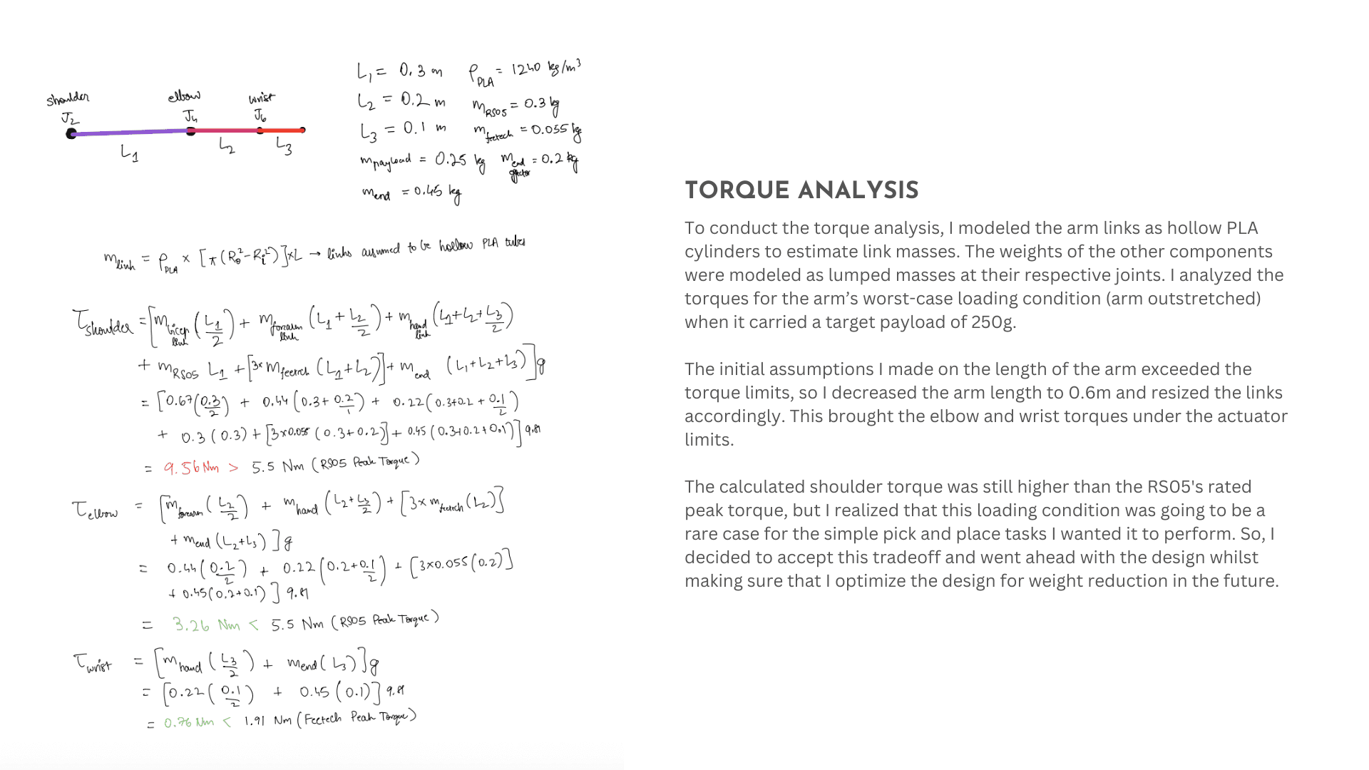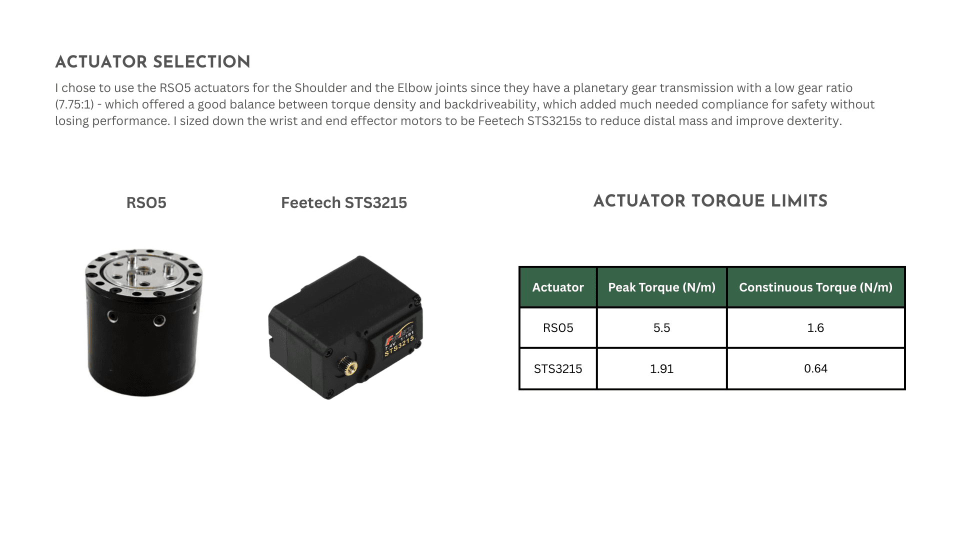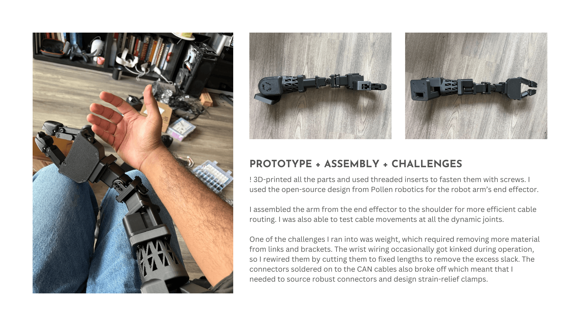 Having been fascinated by the all designs of humanoid robots that launched in 2025, I wanted to learn more about robot hardware design by building my own humanoid robot arm! To make the design more intuitive to teleoperate, I got design requirements like the arm reach, linkage lengths, and joint positions from my own arm. I did sample torque calculations to understand target payload, sized and selected actuators, and did some FEA to validate the structural strength of my arm links. I also learnt about the challenges associated with dynamic wire routing, motor backlash, and reflected inertia,